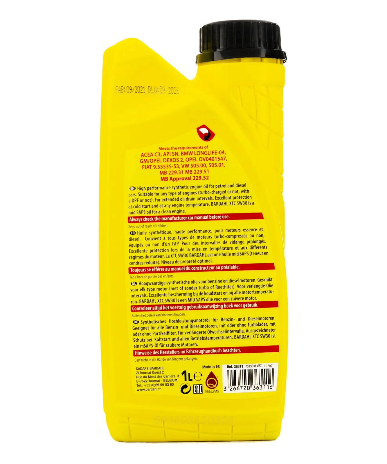 Высокопроизводительное синтетическое масло для бензиновых и дизельных двигателей. Применяется как в двигателях с турбонагнетателем, так и без него, с фильтром твердых частиц (DPF) или без него. Увеличенный интервал замены масла. Превосходная защита в условиях холодного пуска и при любой рабочей температуре. Масло BARDAHL XTC 5W30 имеет пониженное количество сульфатной золы, фосфора и серы (Mid SAPS) за счет чего обеспечивается чистота внутренних деталей двигателя
