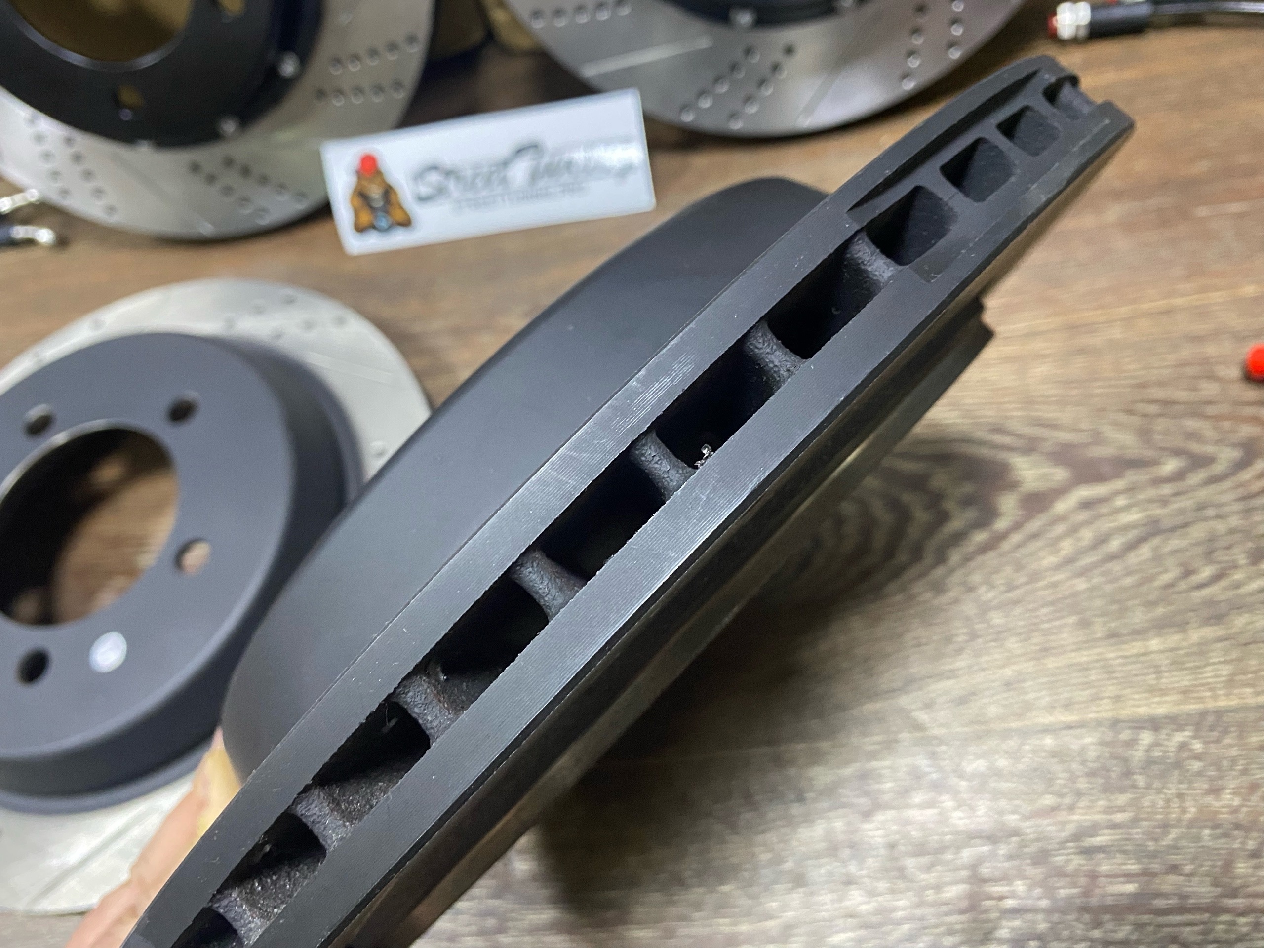 Диски, входящие в комплект, имеют эксклюзивную систему вентиляции, которая увеличивает скорость охлаждения и повышает более чем на 40% стойкость к образованию трещин от тепловых ударов.